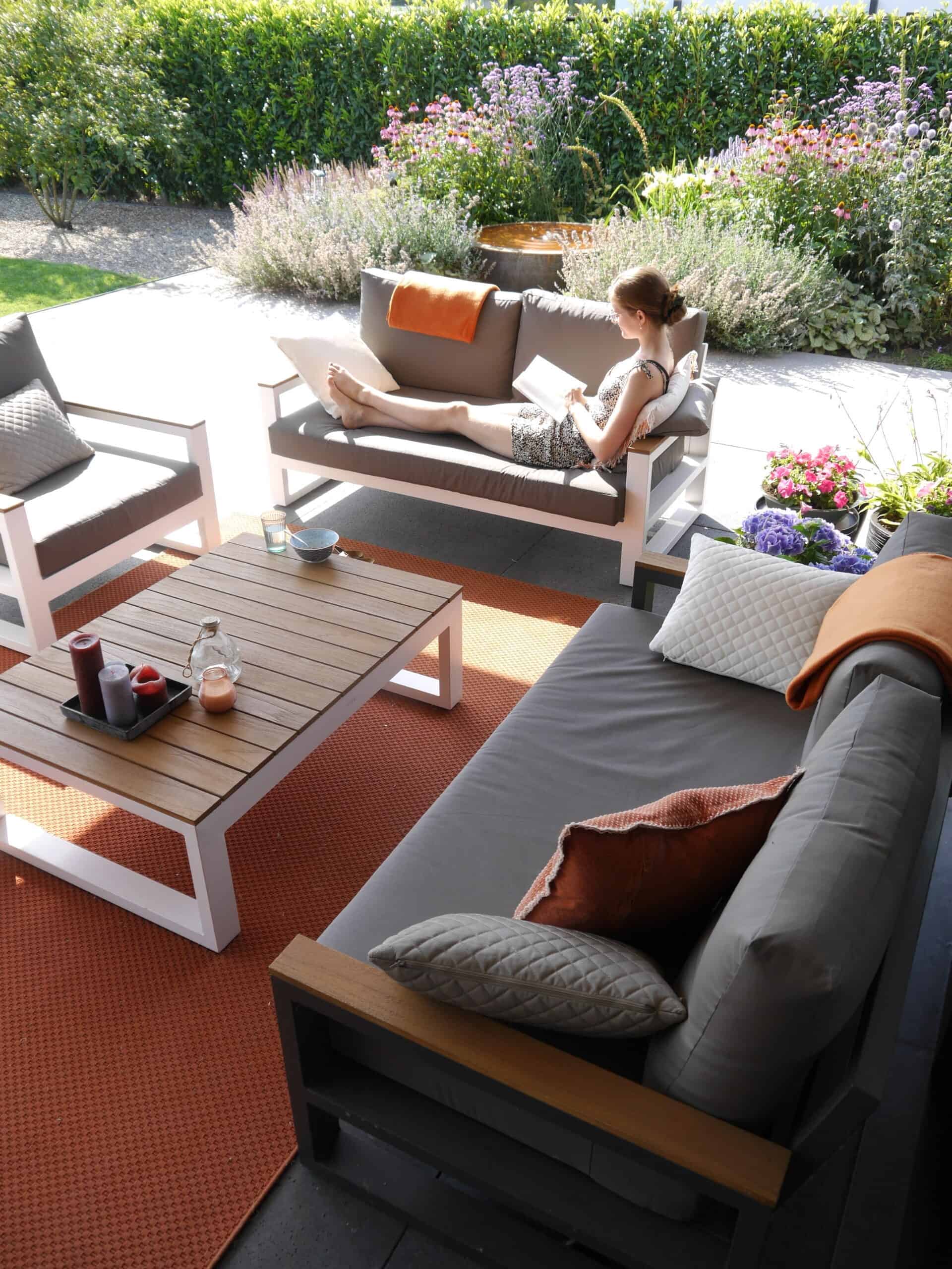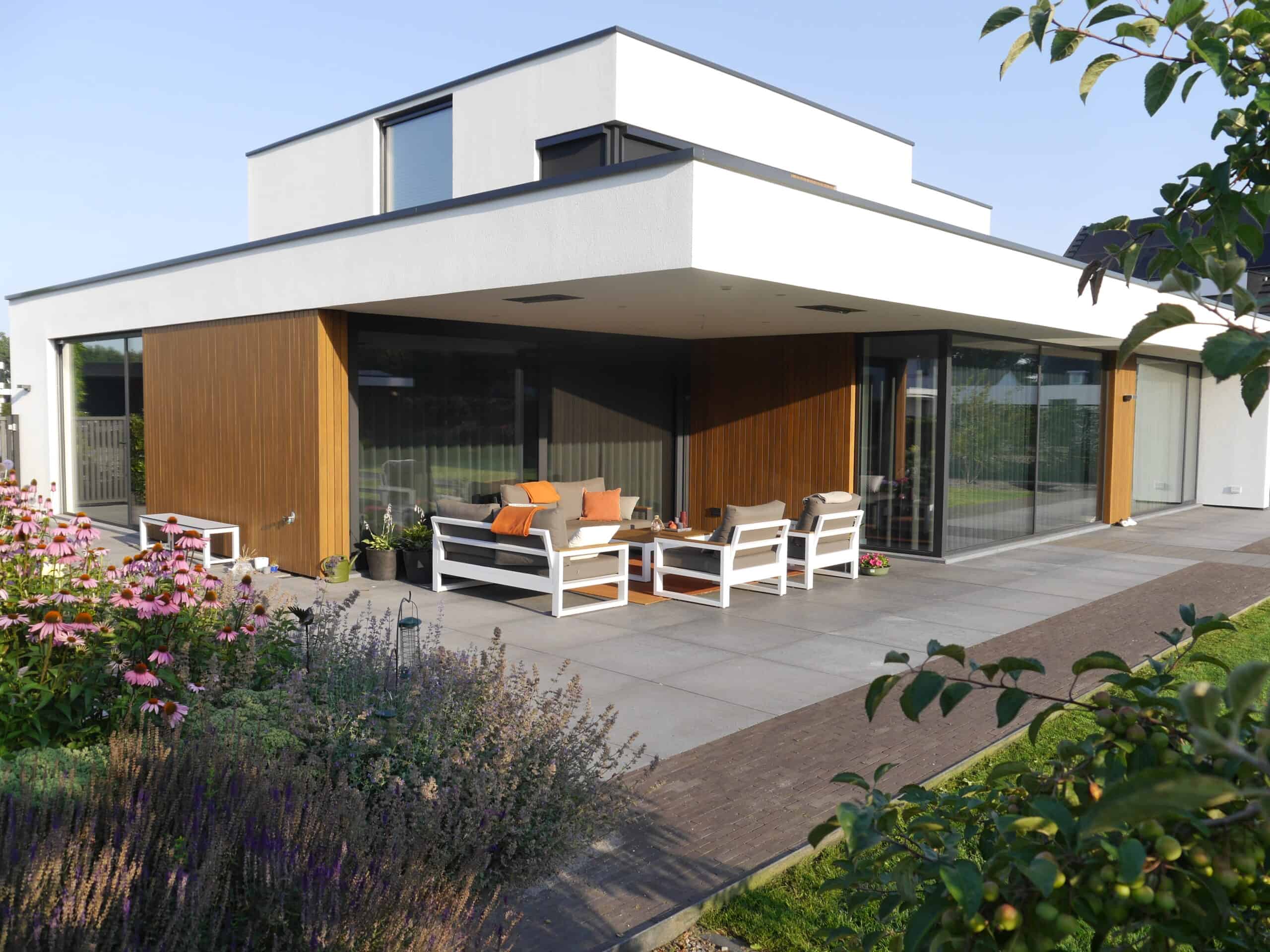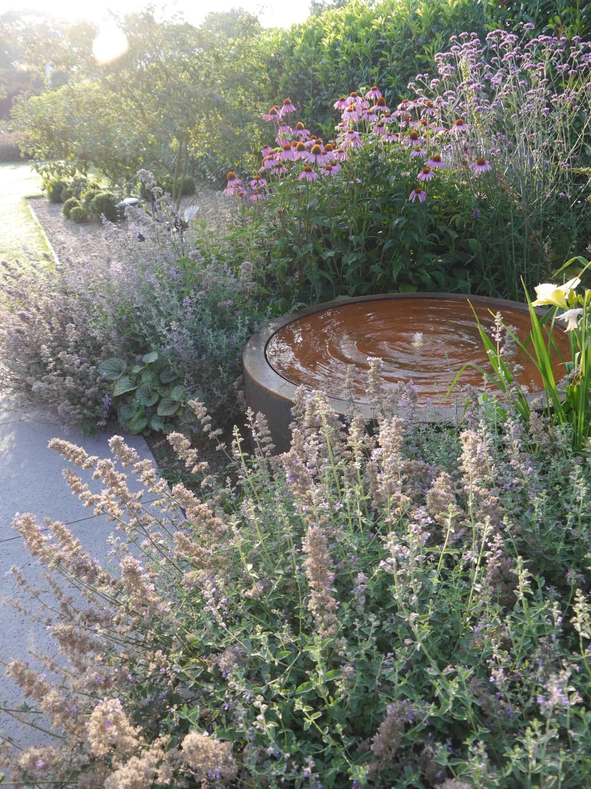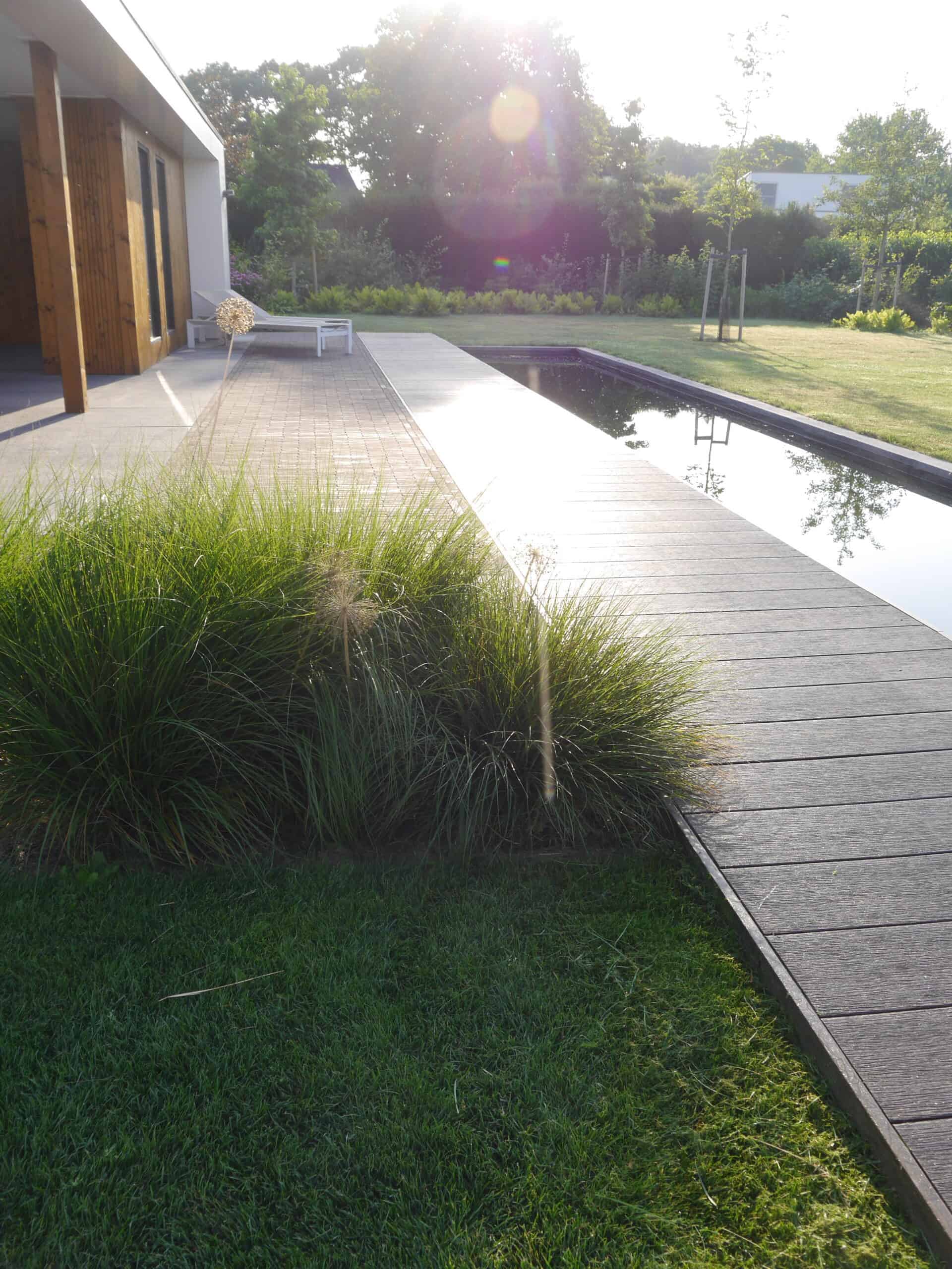 Bij het huis een strakke en moderne vormgeving, zodat de tuin goed aansluit op de stijl van deze nieuwbouwwoning. Grote, strakke Oud-Hollandse tegels hebben we gebruikt voor het hoofdterras met aansluitend een pad van gebakken stenen haaks op de kijkrichting. Een grote ronde watertafel van Cortenstaal zorgt ervoor dat er vanuit het hoofdterras nog meer moois staat om naar uit te kijken, vogeltjes komen er regelmatig drinken en badderen.