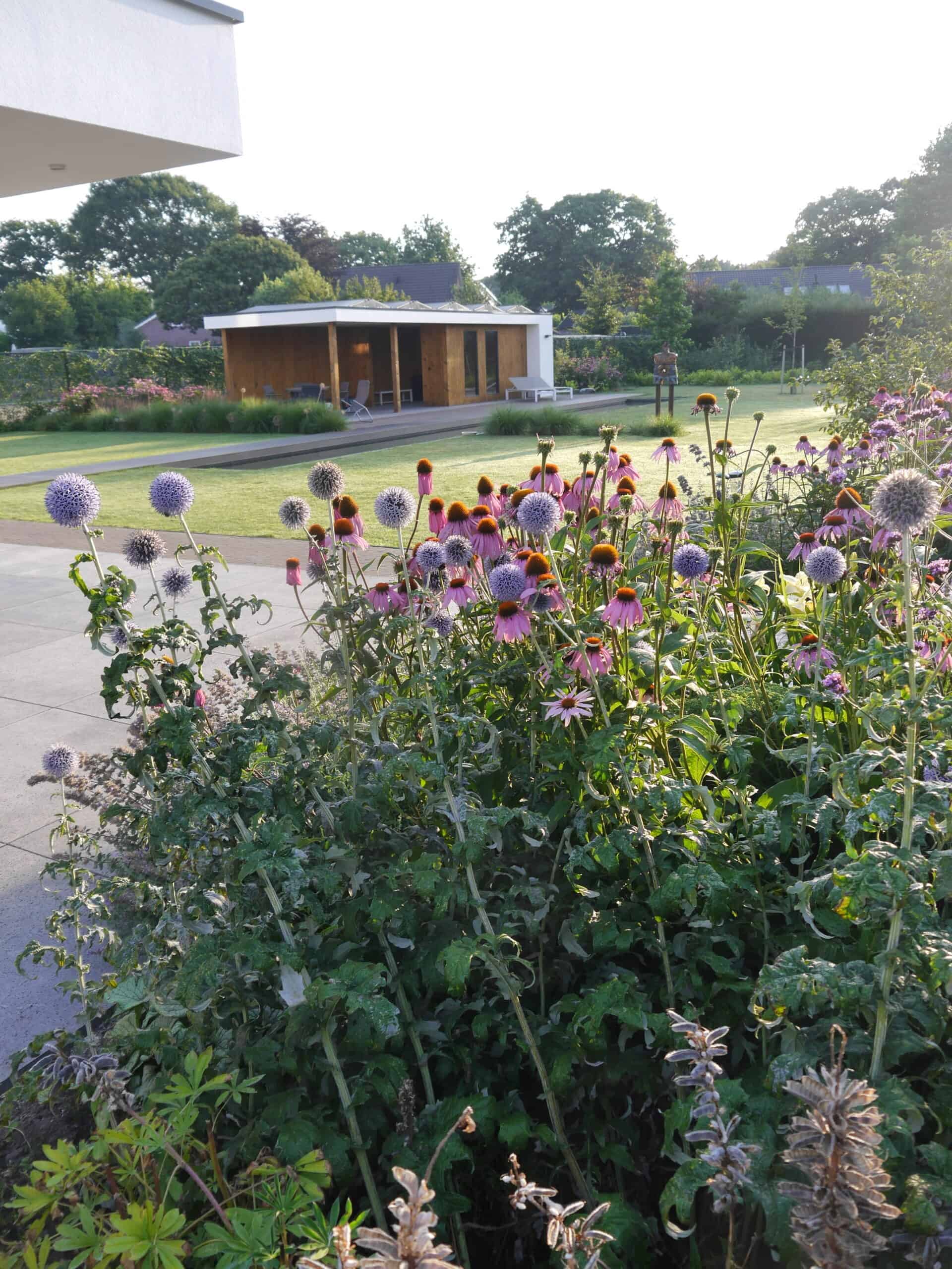 Geleidelijk loopt de strakke vormgeving over naar een natuurlijke vormgeving achterin de tuin. Een ruim gazon begint met rechte lijnen langs de bloemen-en plantenborders en eindigt in organische vormen achterin de tuin o.a. langs de moes-en fruittuin. De bomen, struiken en fruitheesters gaan nog flink groeien, zodat het straks voelt alsof je door je eigen bos loopt.