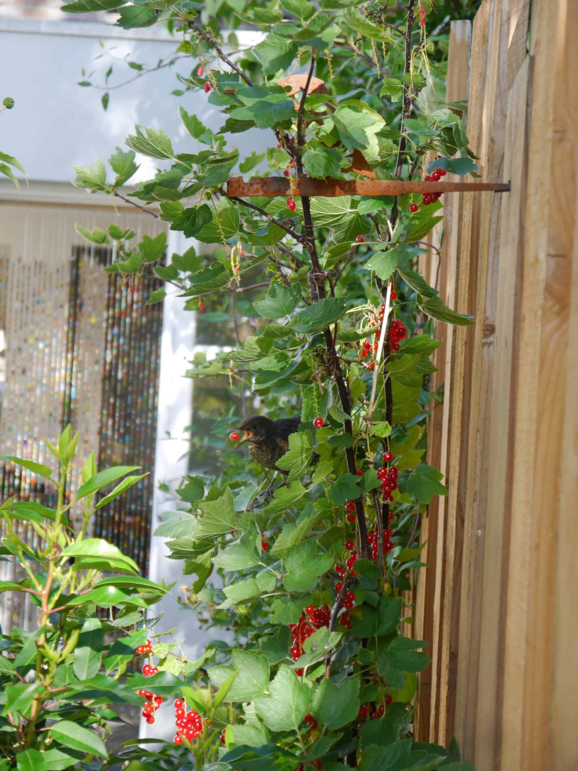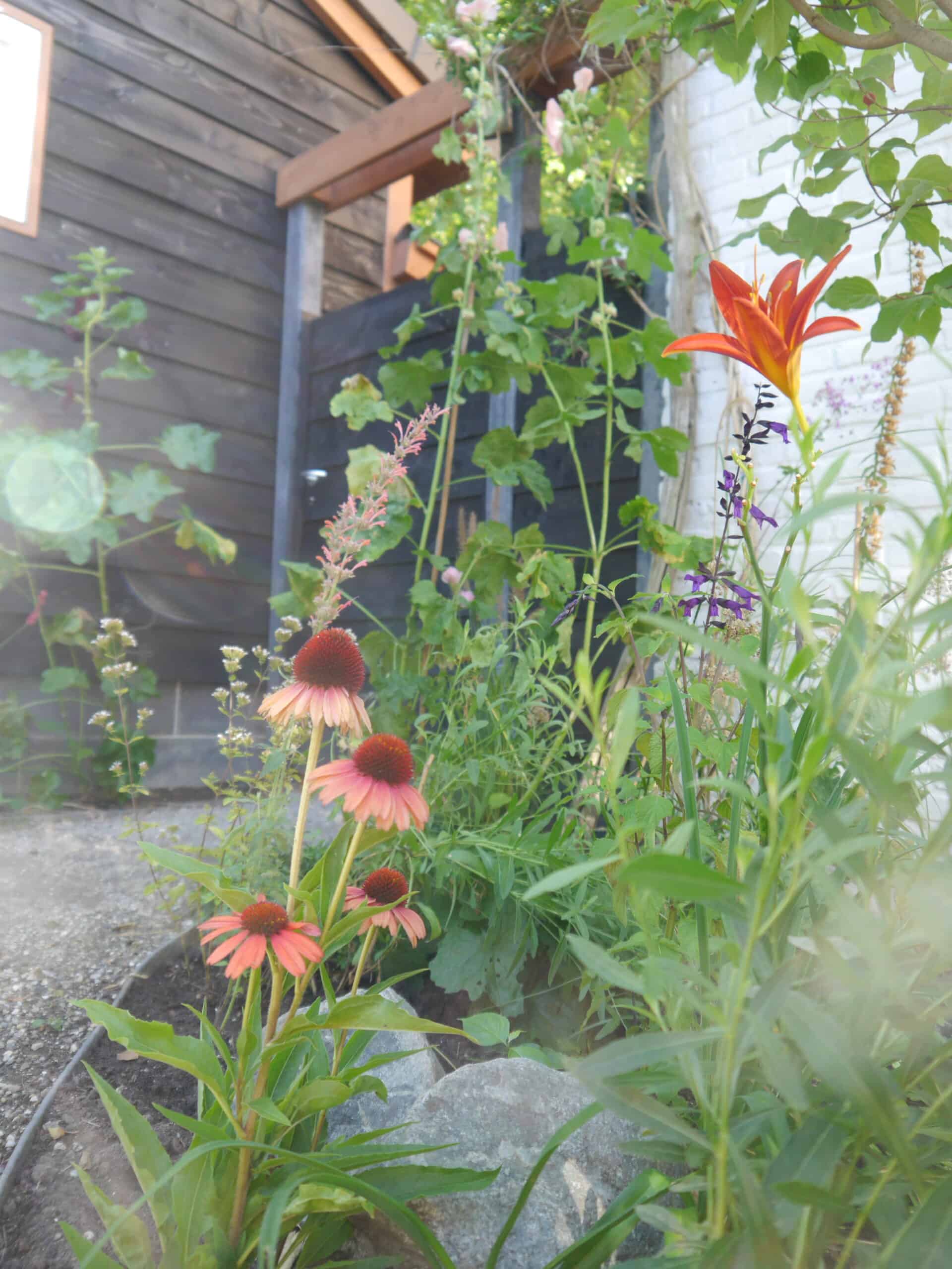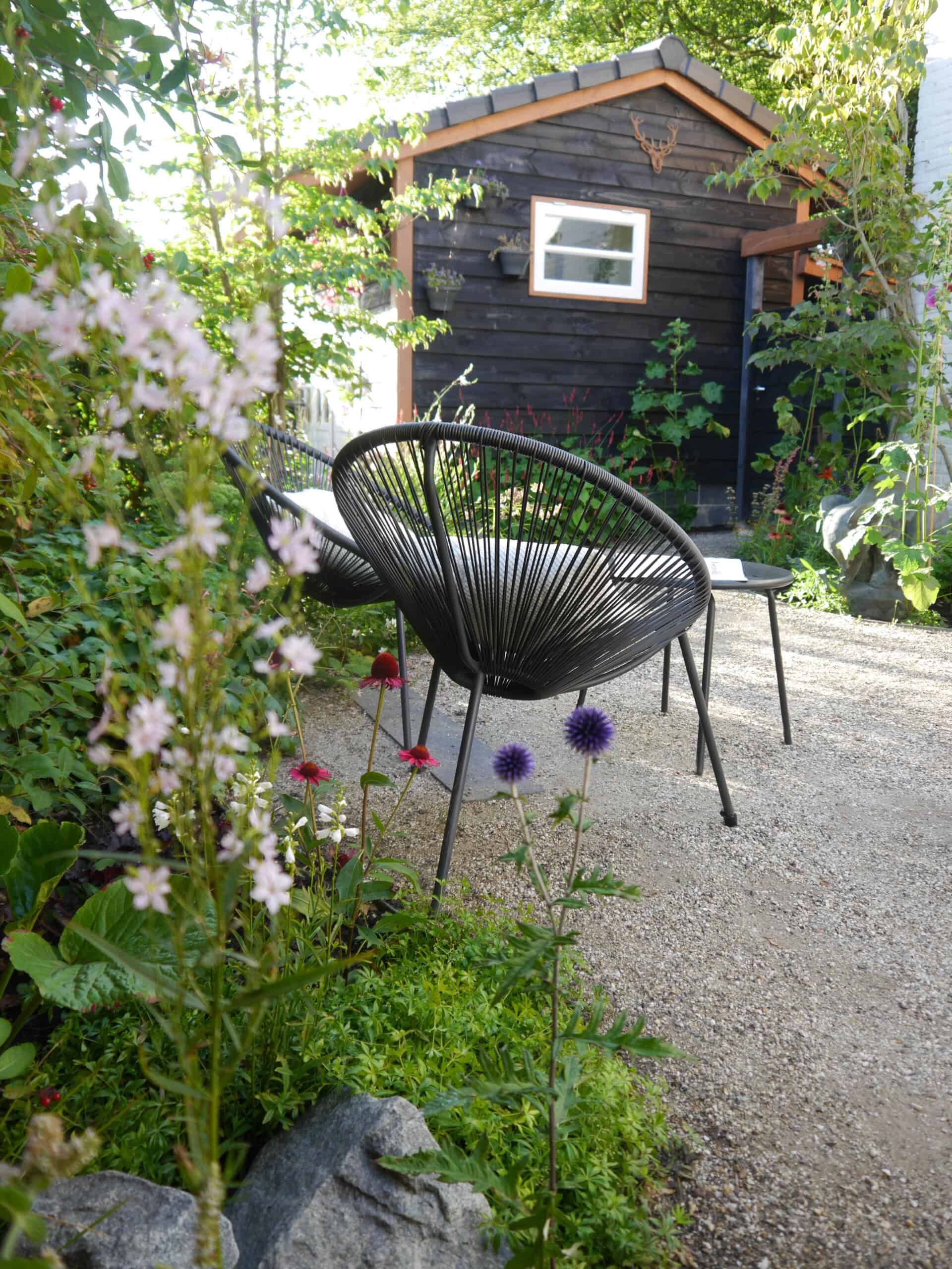 Op het eetterras bij het huis zit je tussen de bijzondere beplanting, het hele jaar is er iets bijzonder te zien qua bloemen, bladkleuren en bladvormen, vruchten en silhouetten. Voor een natuurlijk beeld zijn 44 vaste plantensoorten en cultivars gecombineerd met verschillende siergrassen. De struiken en bomen zijn vooral gekozen om van de tuin een vogelparadijsje te maken. De bessenstruik en de kamperfoelie geven bijv. na de bloei sappige bessen. Malus ‘Red Sentinal’ en de meerstammige Cornus kousa zijn niet alleen mooi, maar geven ook eetbare vruchtjes. Om vlinders en bijen naar de tuin te lokken zijn er veel nectar-en stuifmeelplanten aangeplant.