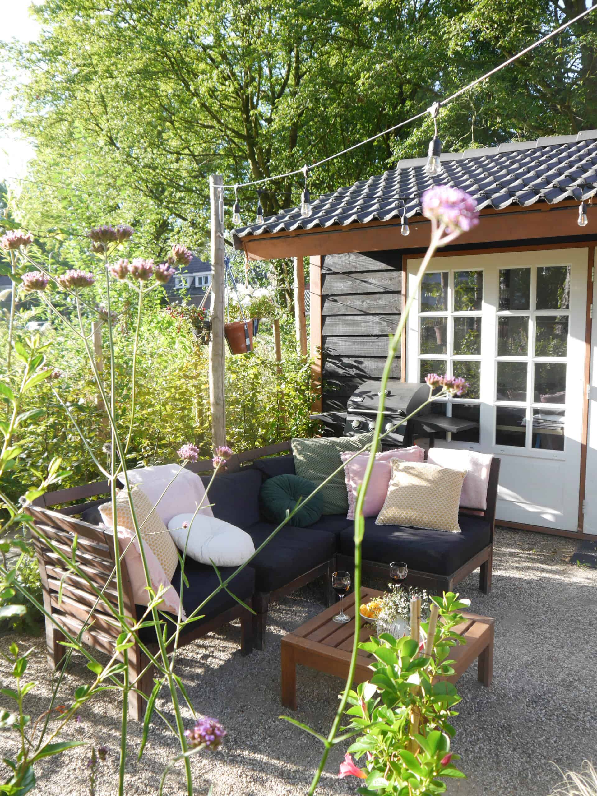 Om dit terras extra privacy te geven, staan er ook aan de achterkant van de tuin een paar hoge kastanjehouten palen, waartussen in de hoogte drie staaldraden zijn gespannen waar een druif langs groeit. Aangezien een druif erg snel groeit, zal het niet lang duren voordat hier een mooi bladerdek is gevormd.