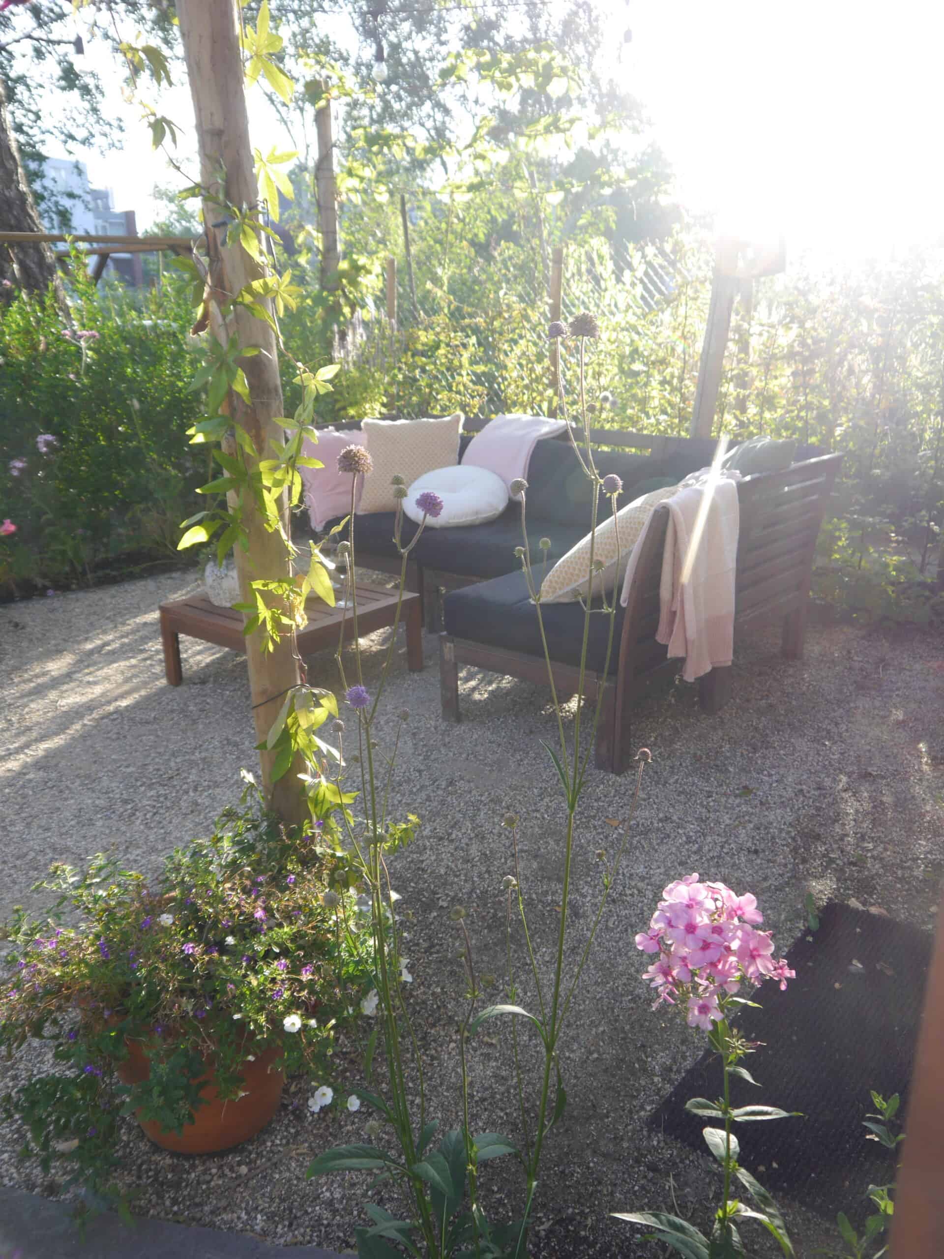 Via dikke grillig gevormde natuursteenplaten kun je naar het 15 cm hoger geleden loungeterras lopen. Voorheen was dit een helling, nu kijkt het wat speelser en spannender. Door de beide terrassen is er altijd een mogelijkheid om in de zon of in de schaduw te gaan zitten. Kastanjehouten palen bieden op het loungeterras de mogelijkheid om hier een schaduwdoek, een hangmat of een lichtsnoer op te hangen en geven steun aan een passiebloem die langs 1 van de palen omhoog klimt om via staaldraad verder te groeien.